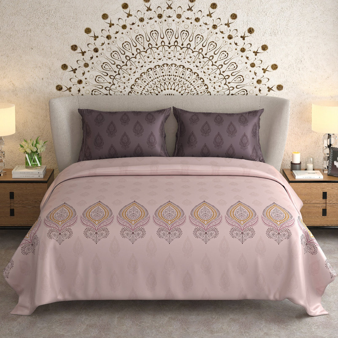 Bring the regal charm of the Pink City into your master suite. This collection features premium long-staple cotton adorned with timeless motifs inspired by Rajasthani palaces. It is where artisanal craftsmanship meets the ultimate luxury of a modern Indian home.